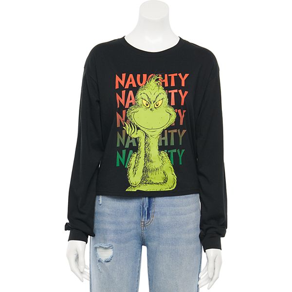Juniors Dr Seuss How The Grinch Stole Christmas Naughty Grinch Long Sleeve Graphic Tee Feed The World Let Them Know Its Christmas Time